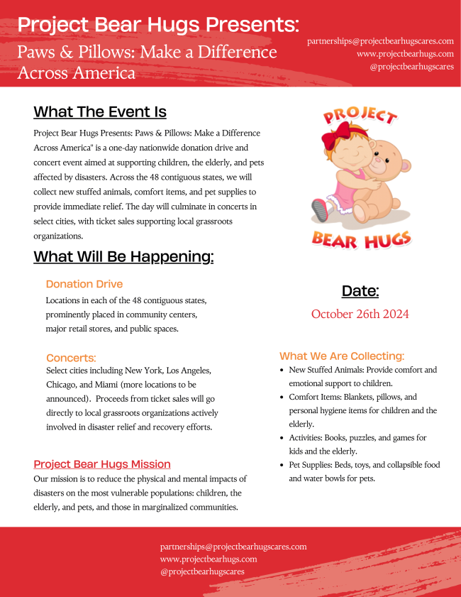 Project Bear Hugs: Paws & Pillows Make a Difference Across America What the Event Is: Project Beer Hugs Presents Paws and Pillows: Make a Difference Across America is a one-day nationwide donation and concert event aimed at supporting children, the elderly, and pets affected by disasters. Across the 48 contiguous states, we will collect new stuffed animals, comfort items, and pet supplies to provide immediate relief. The day will culminate and concerts and select cities, with ticket sales supporting local grassroots organizations. What Will Be Happening: Donation Drive: Locations in each of the 48 contiguous states, prominently placed in community centers, major retail stores, and public spaces. Concerts: Select cities, including New York, Los Angeles, Chicago, and Miami (more locations to be announced). Proceeds from ticket sales will go directly to local grassroots organizations, actively involved in disaster, relief, and recovery efforts. Date: October 26, 2024 What We Are Collecting: New stuffed animals: provide comfort and emotional support to children. Comfort items: blankets, pillows, and personal hygiene items for children and the elderly. Activities: books, puzzles, and games for the kids and the elderly. Pet supplies: beds, toys, and collapsible food, and water bowl for pets. Project mission: mission is to reduce physical and mental impacts of disasters, the most vulnerable populations: children, the elderly, and pets, and those in marginalized communities. For more information: contact partnerships@projectbearhugscares.com, www.projectbearhugs.com, @Projectbearhugscares Download Media Kit? Download the media kit here.